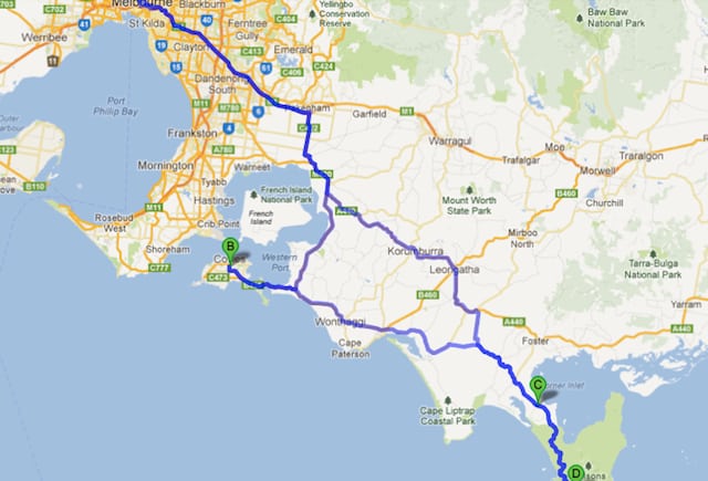 Here is a small map of this driving route from Melbourne to Wilsons Prom.